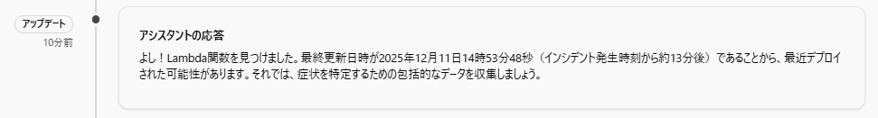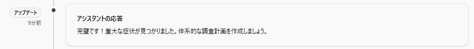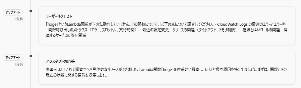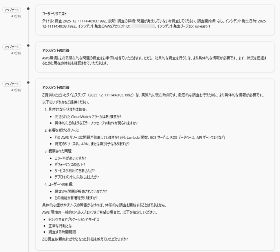 このように、左側に調査のタイムライン、右側にチャットが表示されます。