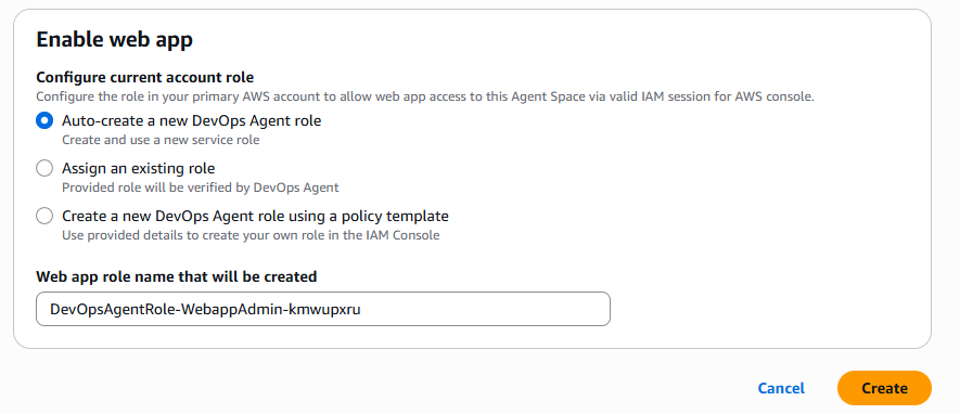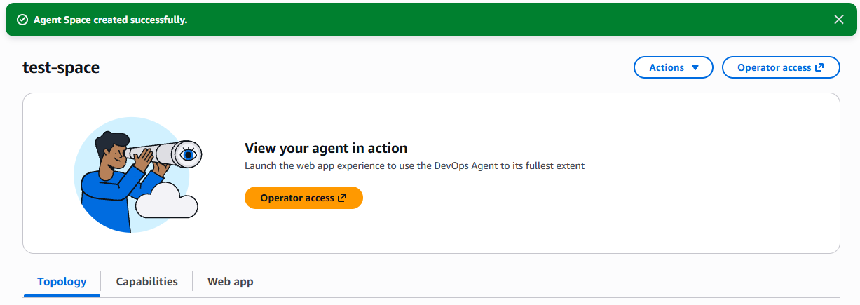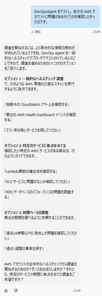 AWSマネジメントコンソールの外部サイトとして「DevOps Agent Webアプリ」の画面が表示されます。