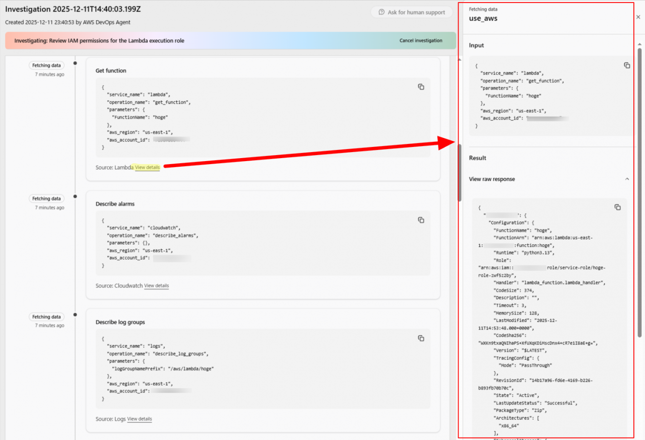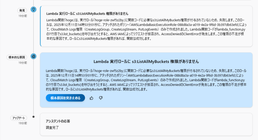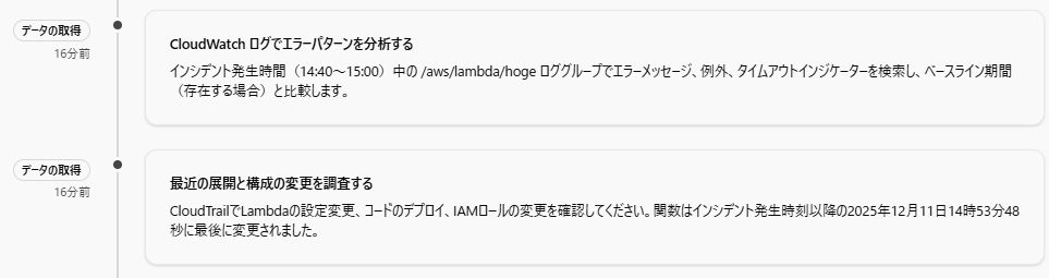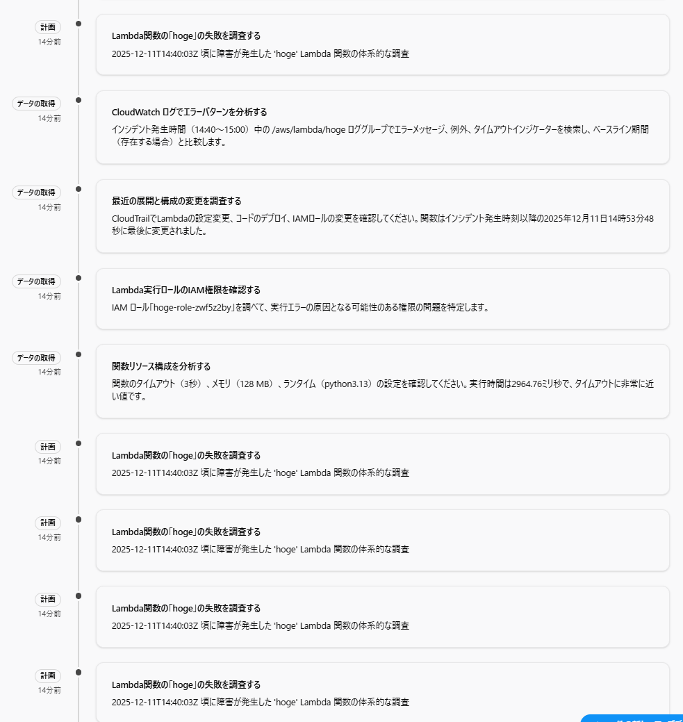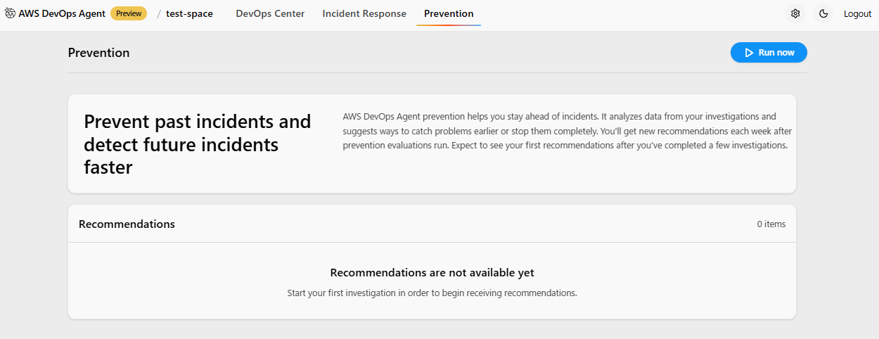 インシデント調査全体のパターンを分析し、将来のインシデントを予防するための推奨事項を提供してくれる機能です。この機能はDevOps AgentのWebアプリから手動で実行できます。