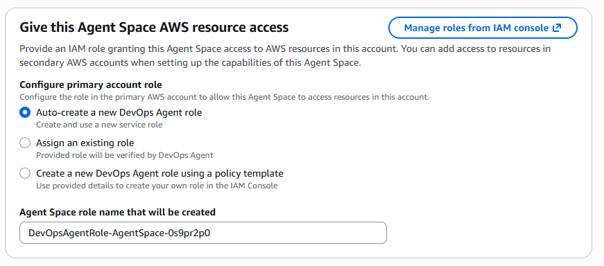 Agent SpaceがAWSアカウントにアクセスするためのロールを作成します。(プライマリアカウントロール)