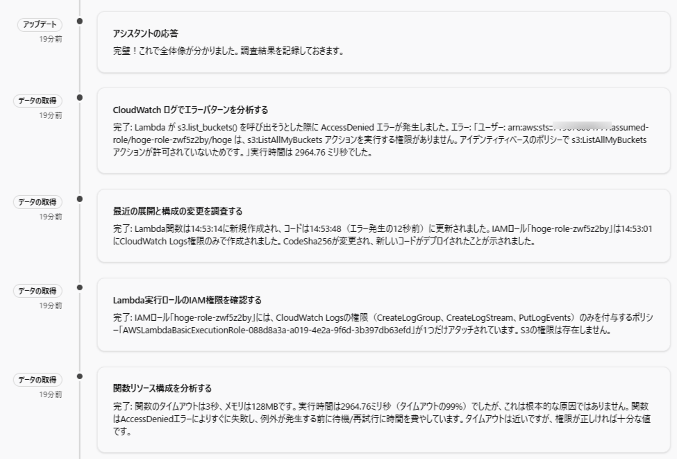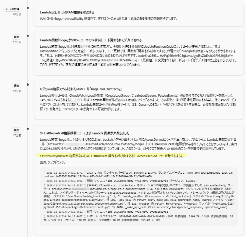 Lambdaのロールを確認し、観察を重ね、AccessDeniedのエラーにたどり着きました。
