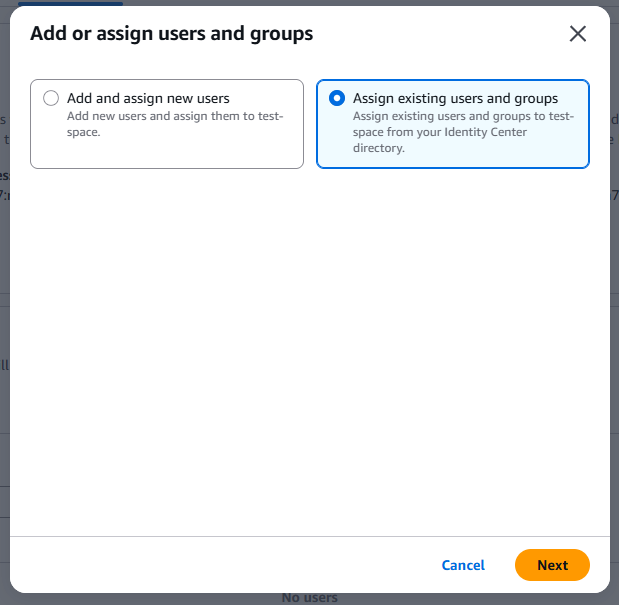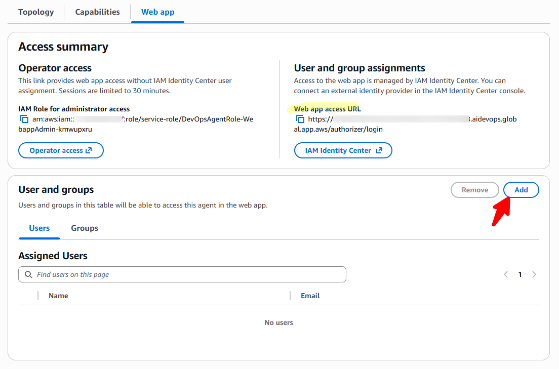 Identity Centerで認証を行う場合のWebアプリのURLが発行されました。なお、オペレーターアクセスも引き続き利用可能です(画面左上にあります)。Identity Centerのユーザーまたはグループに対してアクセス権限を付与していきます。