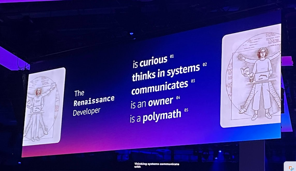 ワーナーさんは、開発者を取り巻く昨今の状況をルネサンス期になぞらえ、現代の開発者が成功するための指針として「ルネサンス開発者」という5つの資質からなるフレームワークを提唱されました。