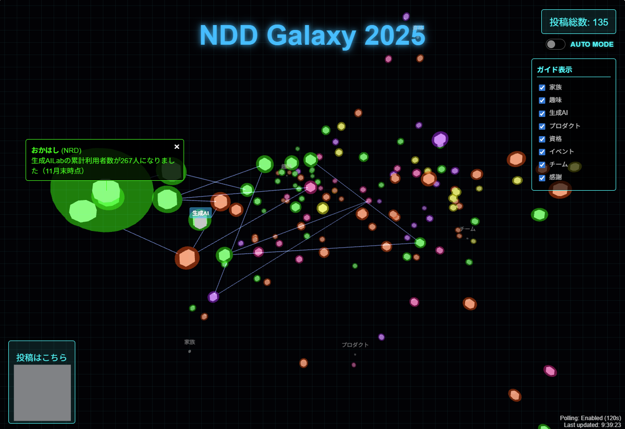 昨年末、社内にて社員参加型のインタラクティブな企画「NDD Galaxy 2025」を実施しました。 今回は、この企画の裏側にある技術的な仕組み、特にGoogle Gemini APIを用いたEmbedding(ベクトル化)の活用と、AIコーディングによる爆速開発について解説します。