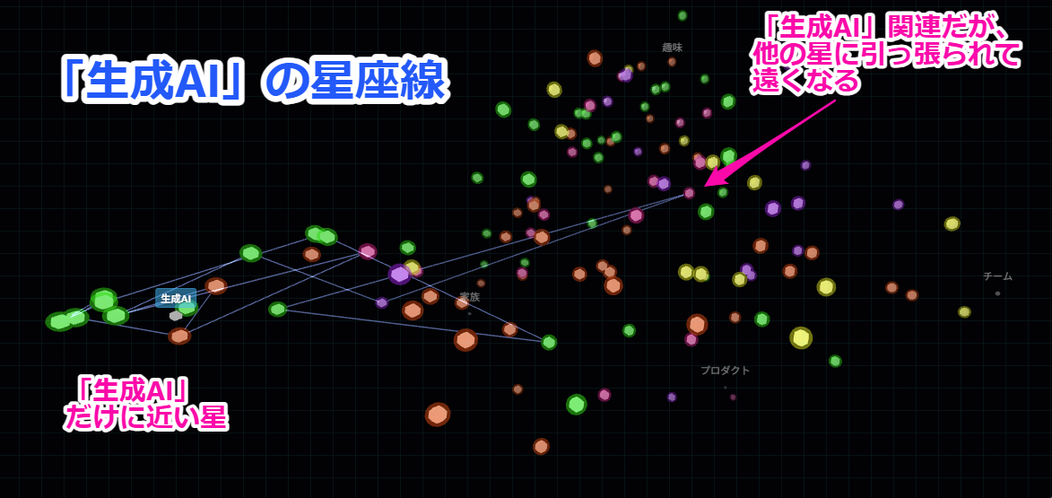 これにより、「今年は『技術』に関する話題が多かったな」といった傾向を視覚的に把握できるようになっています。 一つのガイドから見たときに近い星でも、他のガイドに引っ張られると遠ざかってしまうことがありますが、こうして線を繋ぐことで「実は関連度が高かった星」を再発見できるのも面白いポイントです。