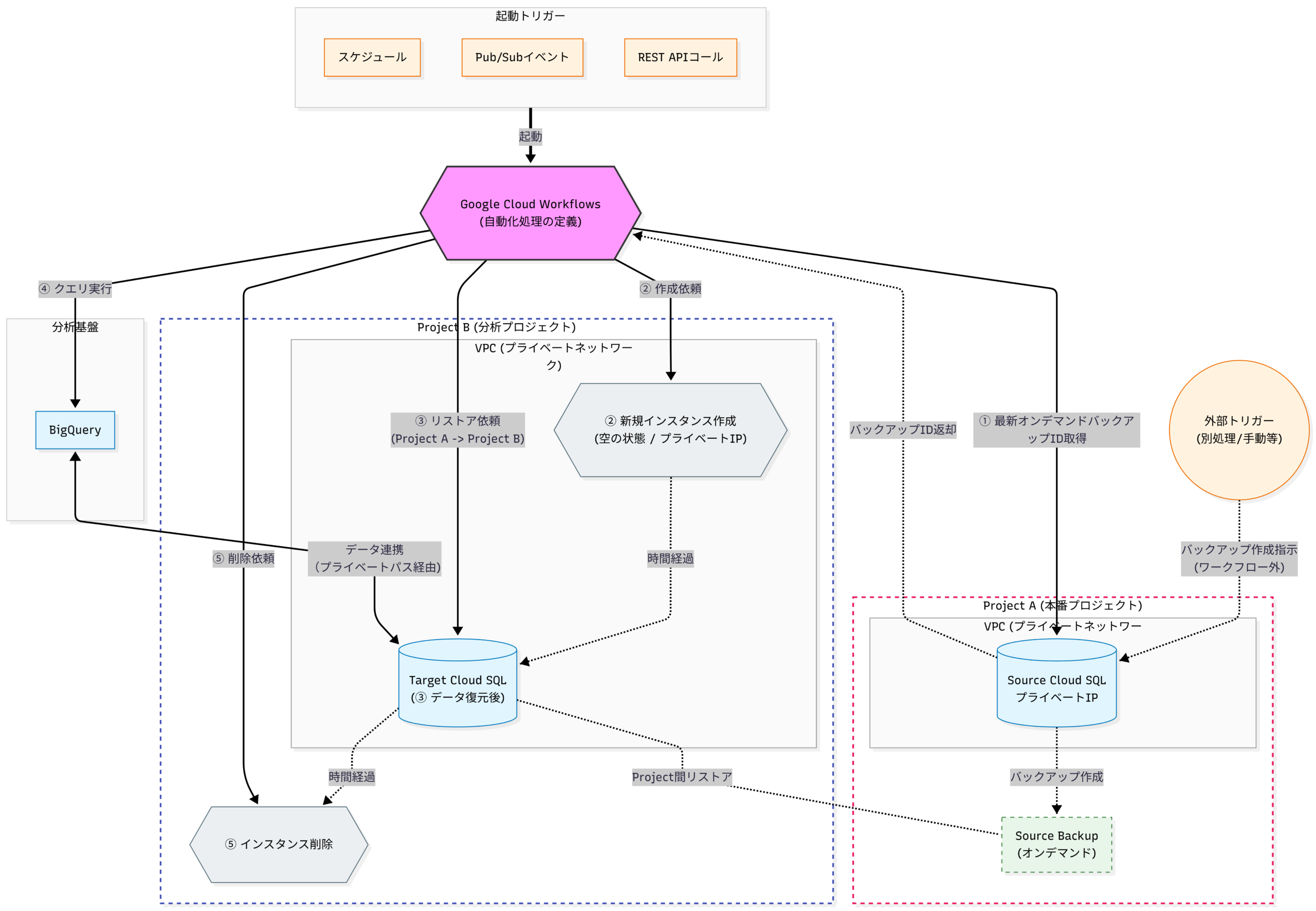 本番ワークロードへの影響を最小限に抑え、安全にデータ連携の検証や導入を行うためには、「本番DBのバックアップを別プロジェクトのインスタンスに復元(リストア)し、そこから移行作業を行う」のが、最も現実的で納得感のあるアプローチではないでしょうか。