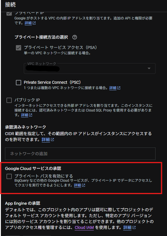 この際、Cloud SQLの接続設定の「プライベートパスを有効にする」にチェックを入れることで、BigQuery – Cloud SQL間の通信が内部直接パス参照となります。
